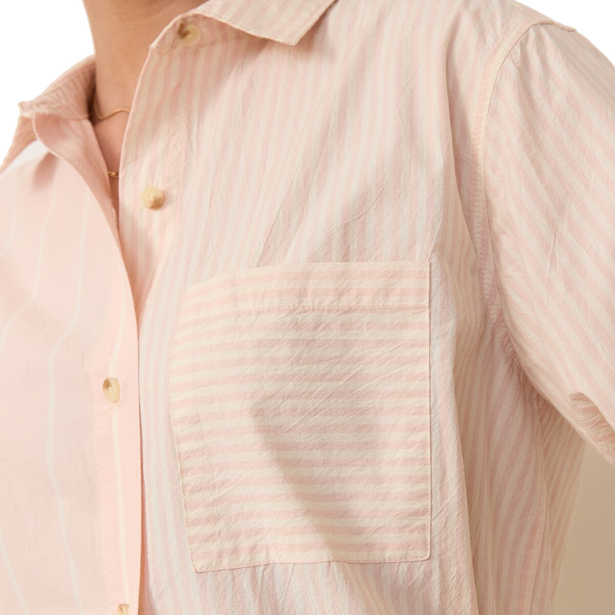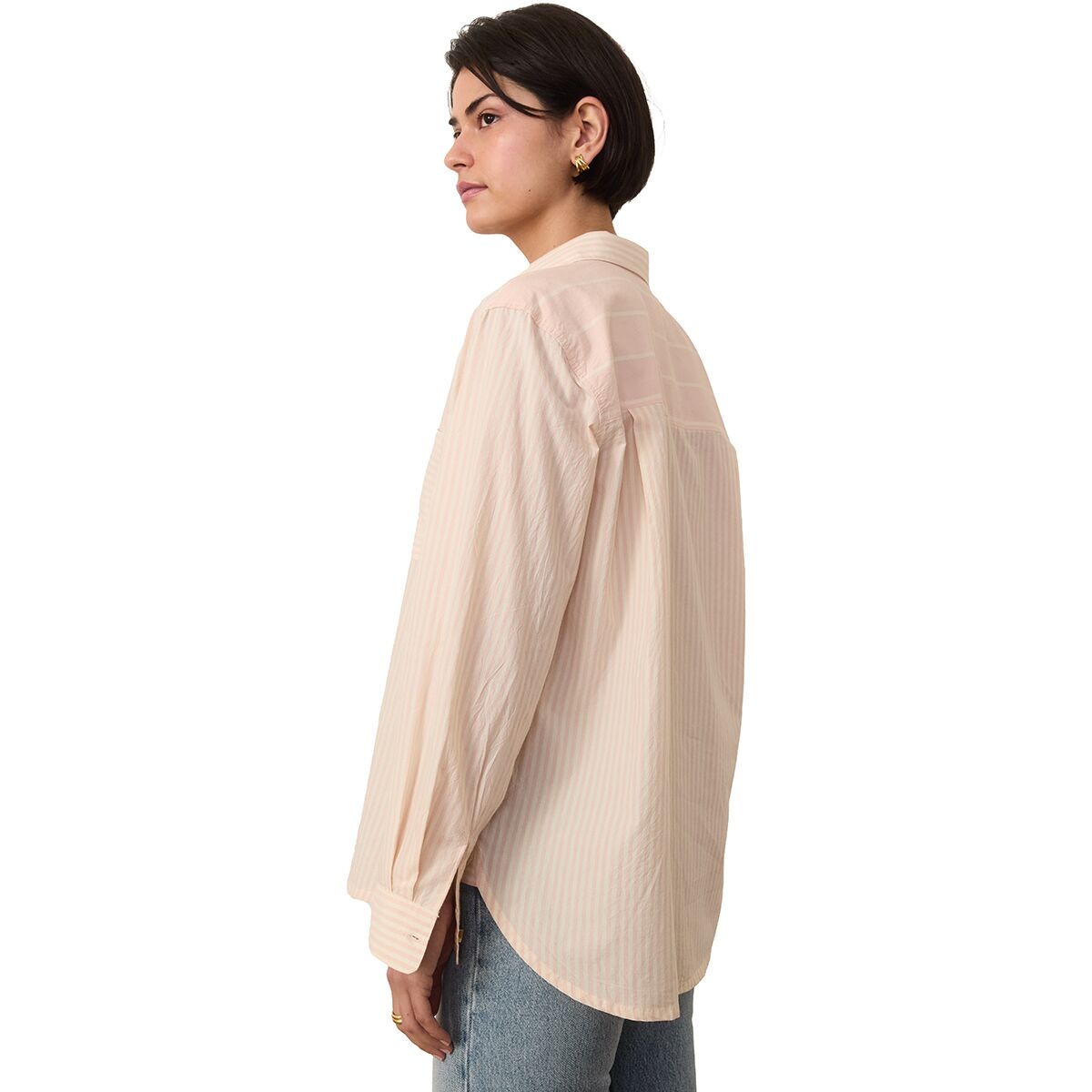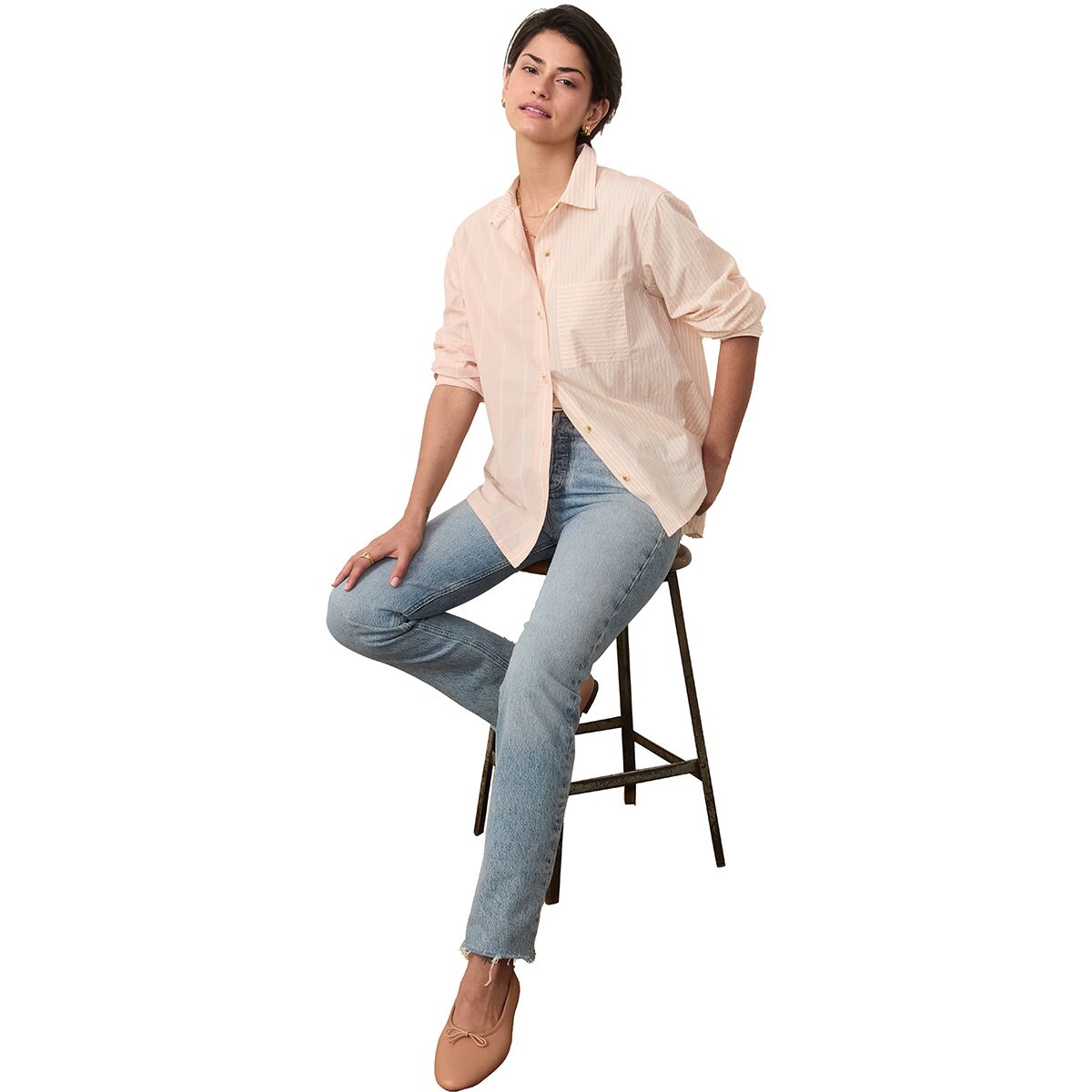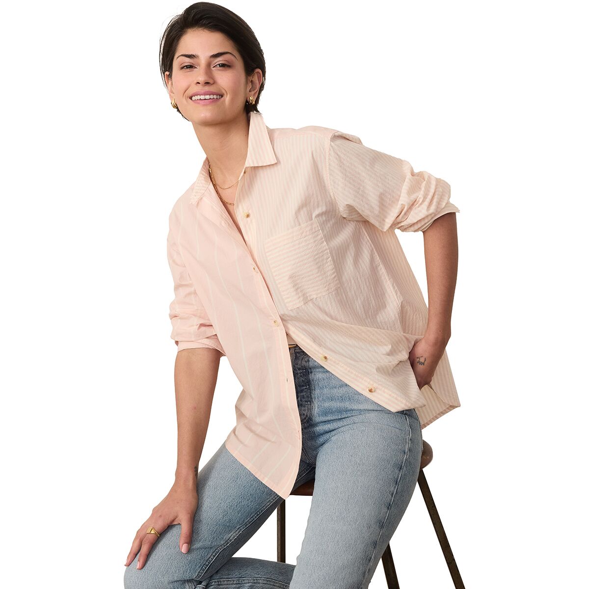 "The Abbey Poplin Shirt is my go-to for effortless style. The Pima cotton fabric is incredibly soft and breathable, and the mix of stripe directions adds a unique touch. I love wearing it buttoned up for a polished look or open over a tank for a relaxed, laid-back vibe."