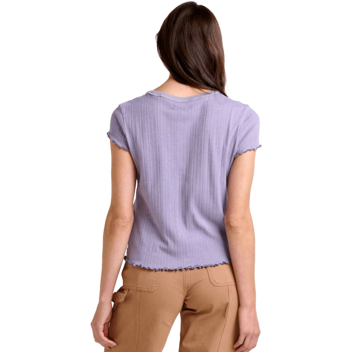 "I love how the Foothill Pointelle Baby T-Shirt brings that ‘90s vibe with a fresh, modern feel. The soft organic cotton and recycled polyester blend is breathable and comfortable, while the pointelle fabric adds a subtle texture that makes it stand out. The cropped fit hits just right for high-waisted jeans or shorts, and the lettuce hem gives it a fun, laid-back touch. Whether I’m layering it under a jacket or wearing it solo on a warm day, it’s a perfect everyday essential."