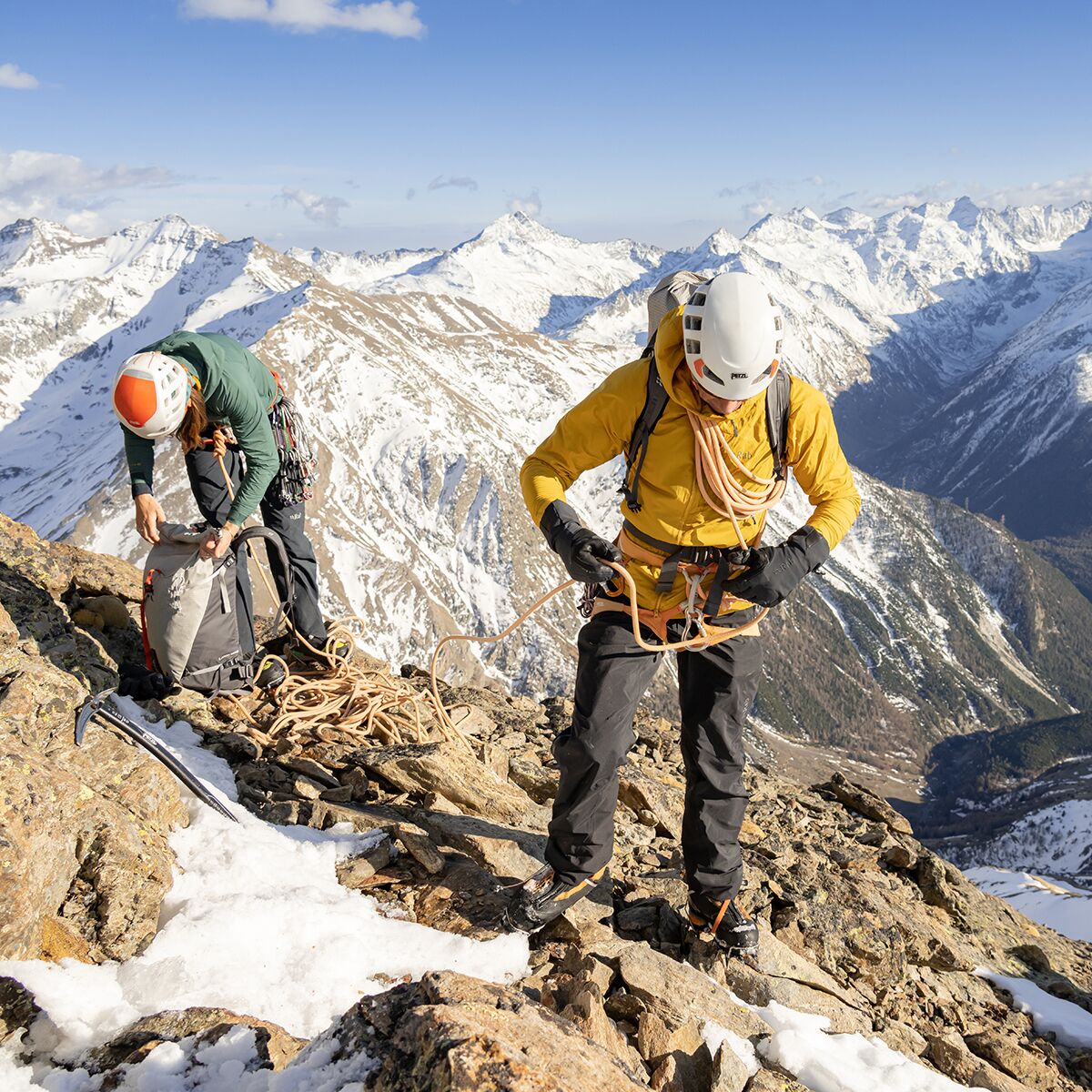 On long alpine approaches, we depend on the Rab Vapour-Rise Summit Jacket to keep us cool on the push, dry under weeping rock, and warm through the belay. The fleecy lining wicks away sweat as we move and traps warm air when we’re standing still, while the treated exterior sheds ice crumbles and spindrift. As we climb, the raglan sleeves and underarm panels give our shoulders full range. When we bring up our second, the two-way front zip gives us easy access to our belay loop, and the adjustable cuffs cinch tight to ensure they don’t get caught up in our device.