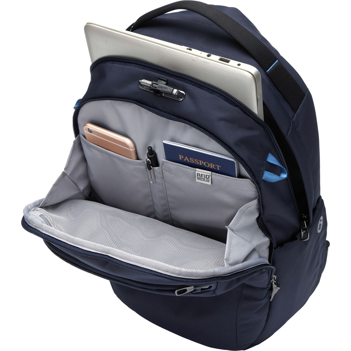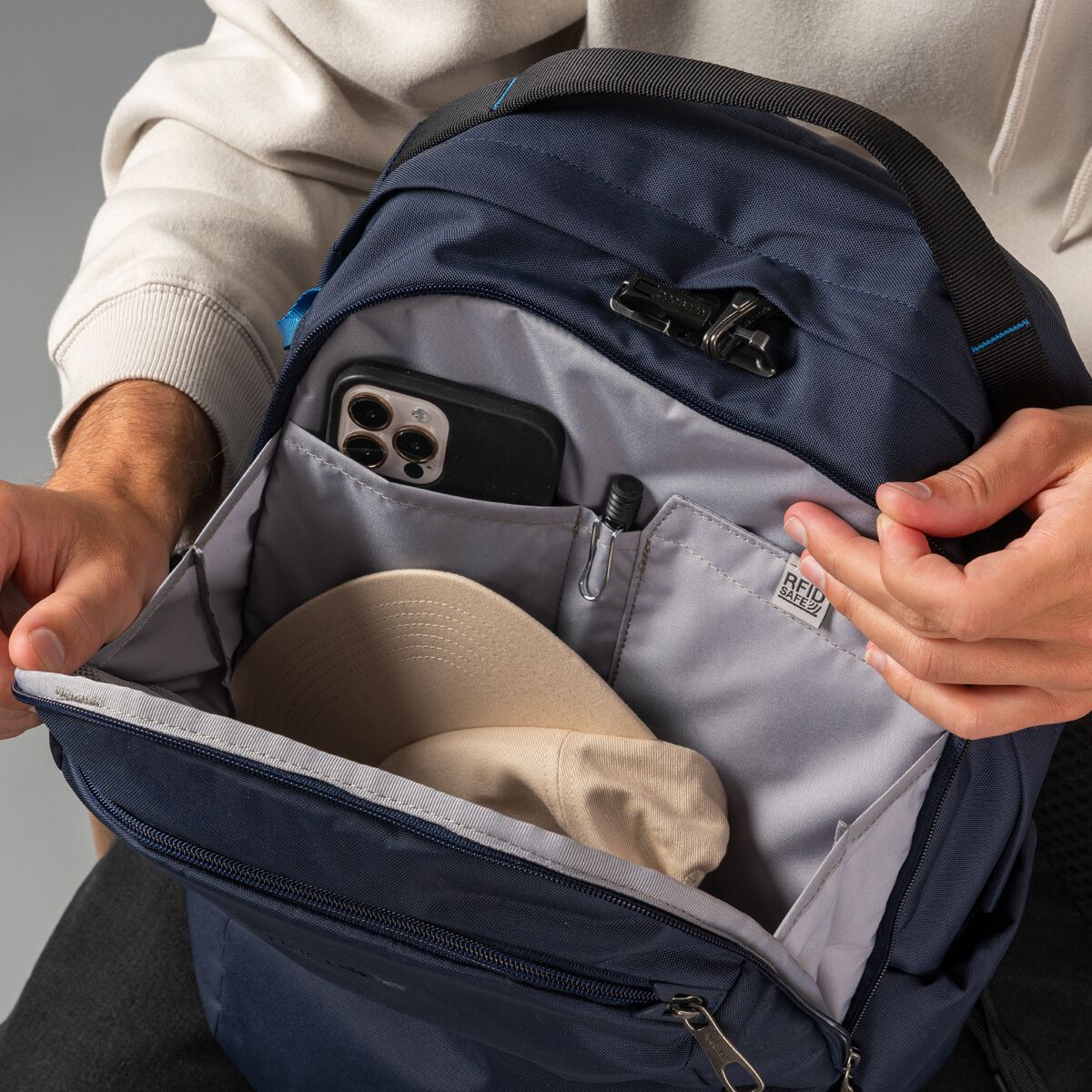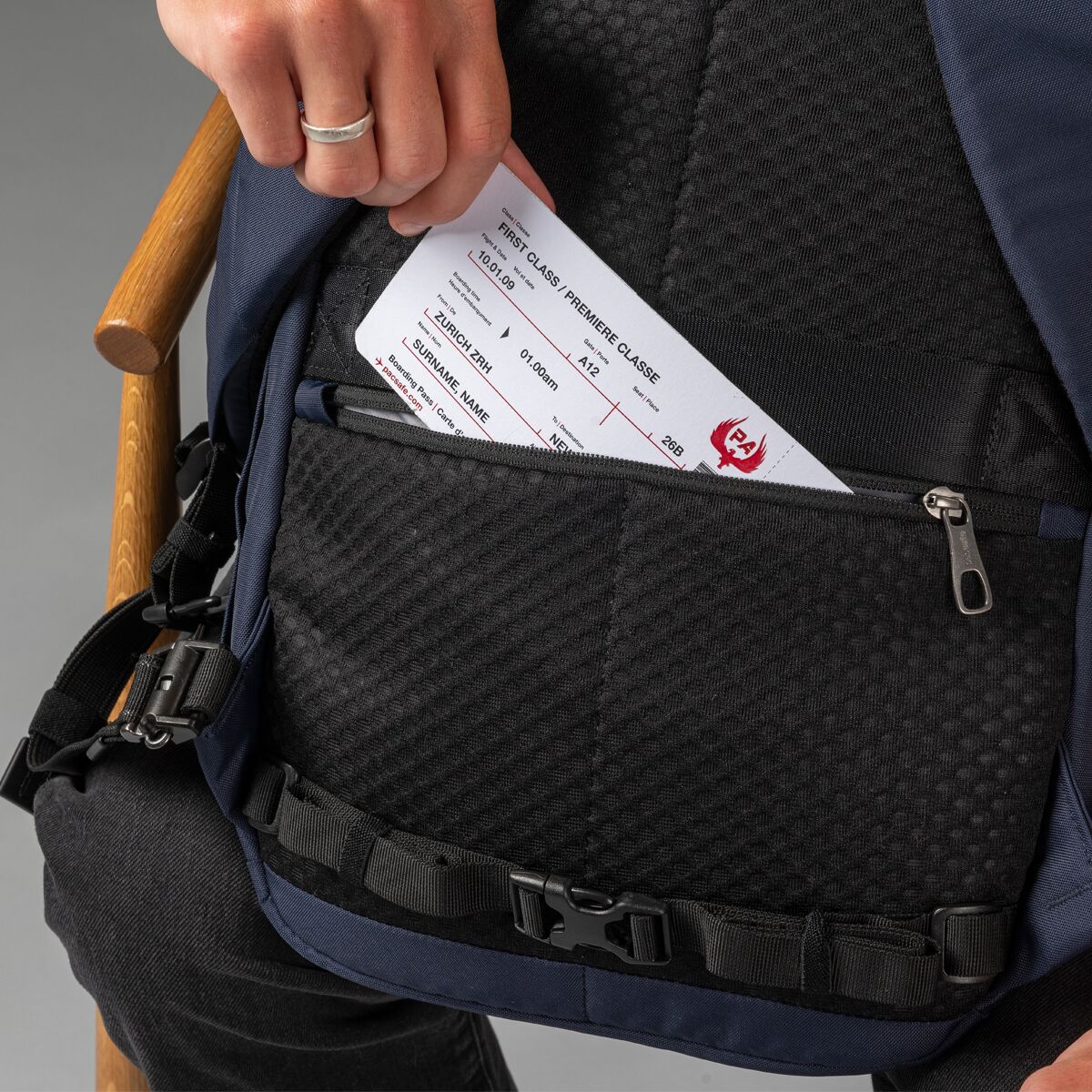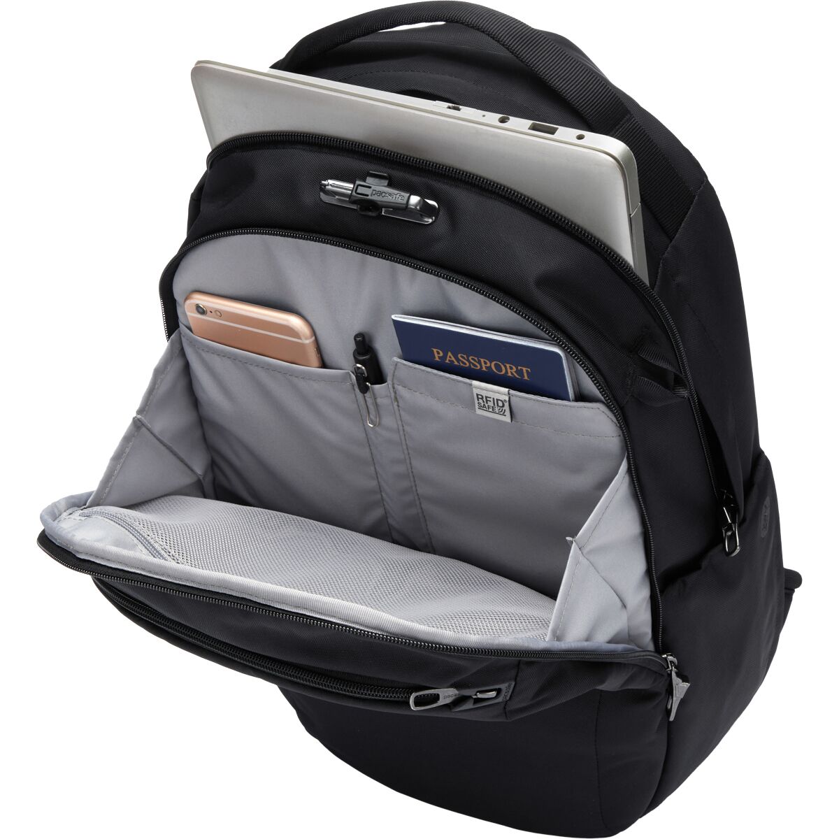 • RFID-blocking pocket safeguards credit cards and passports