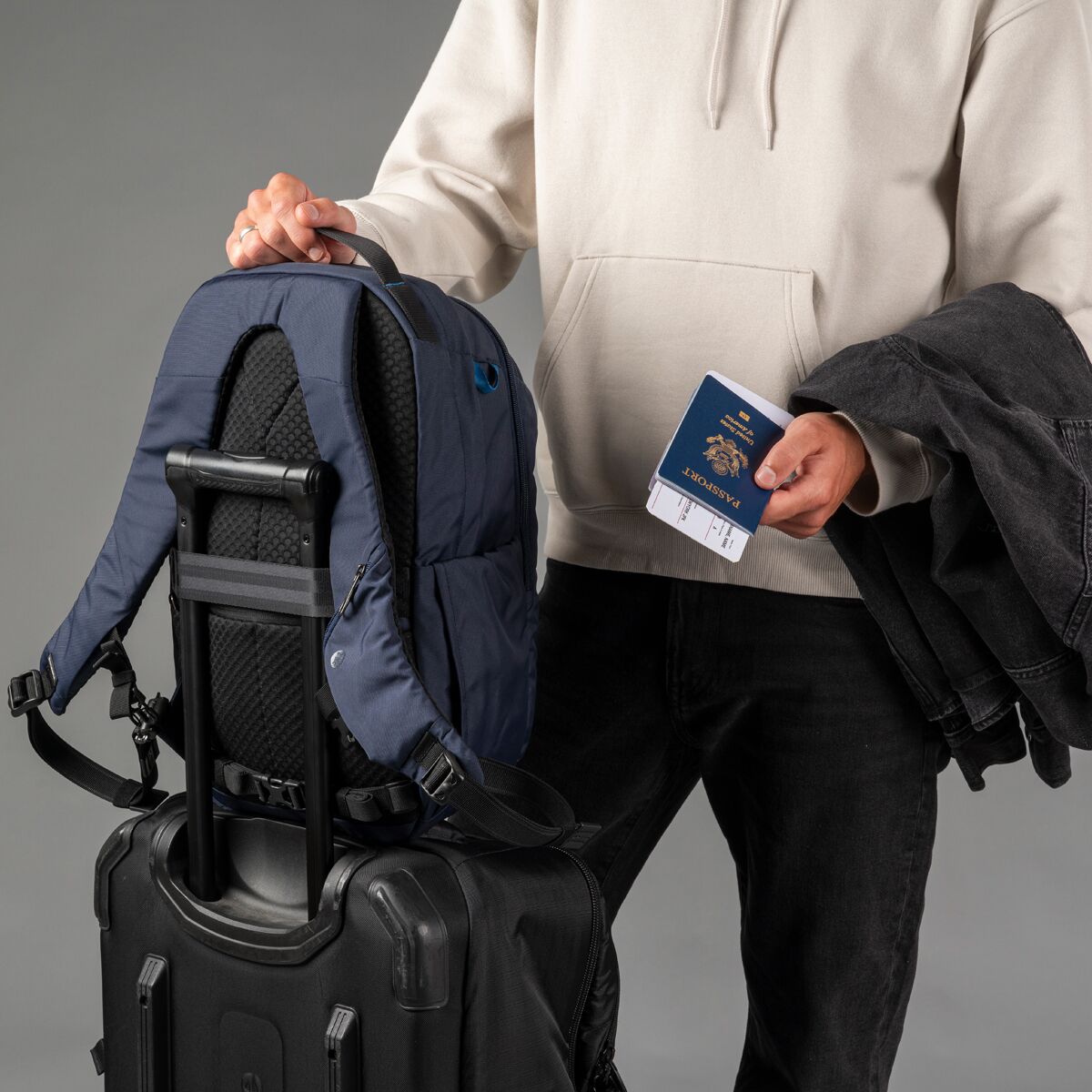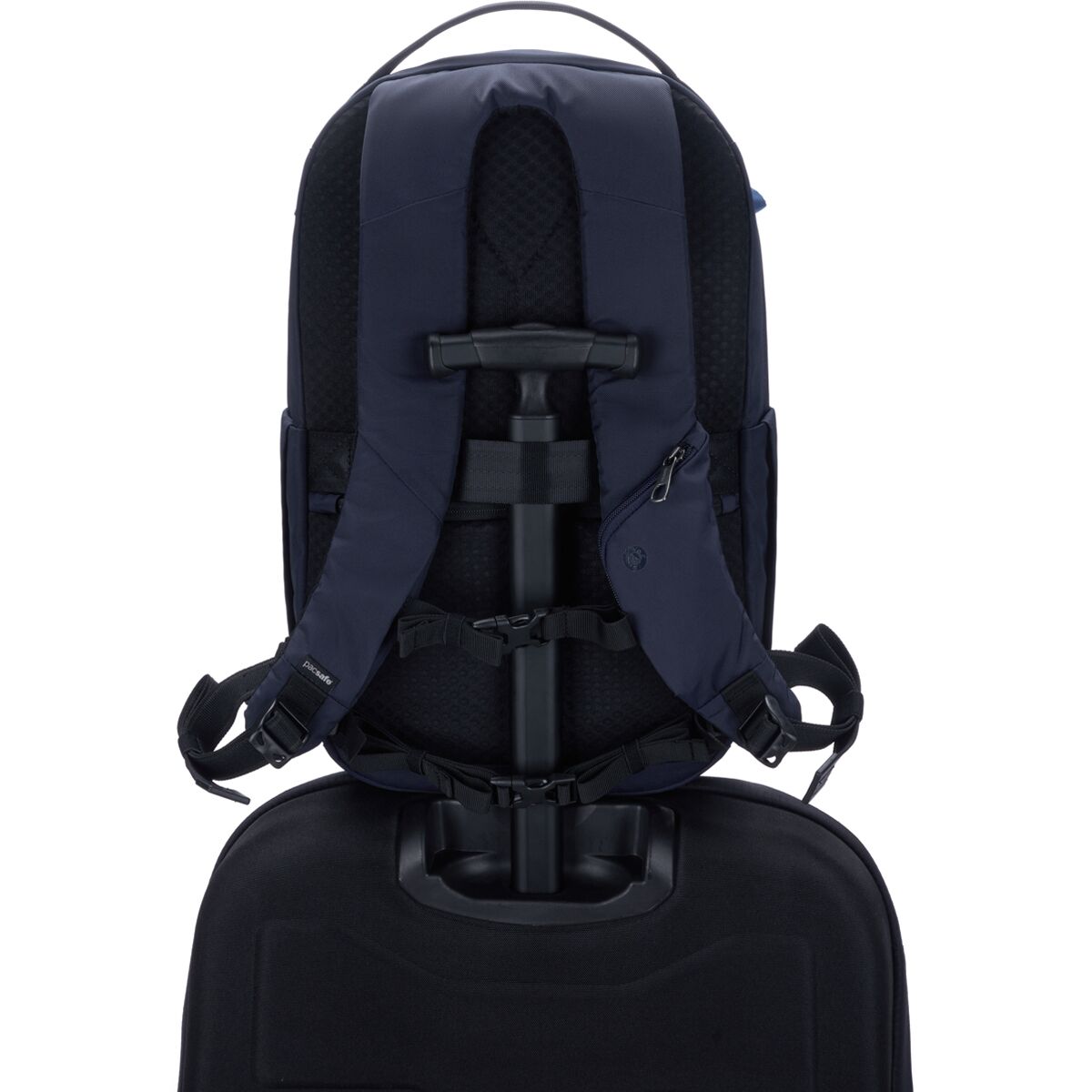 • Luggage pass-through sleeve slides onto rolling bag handles for easy airport travel