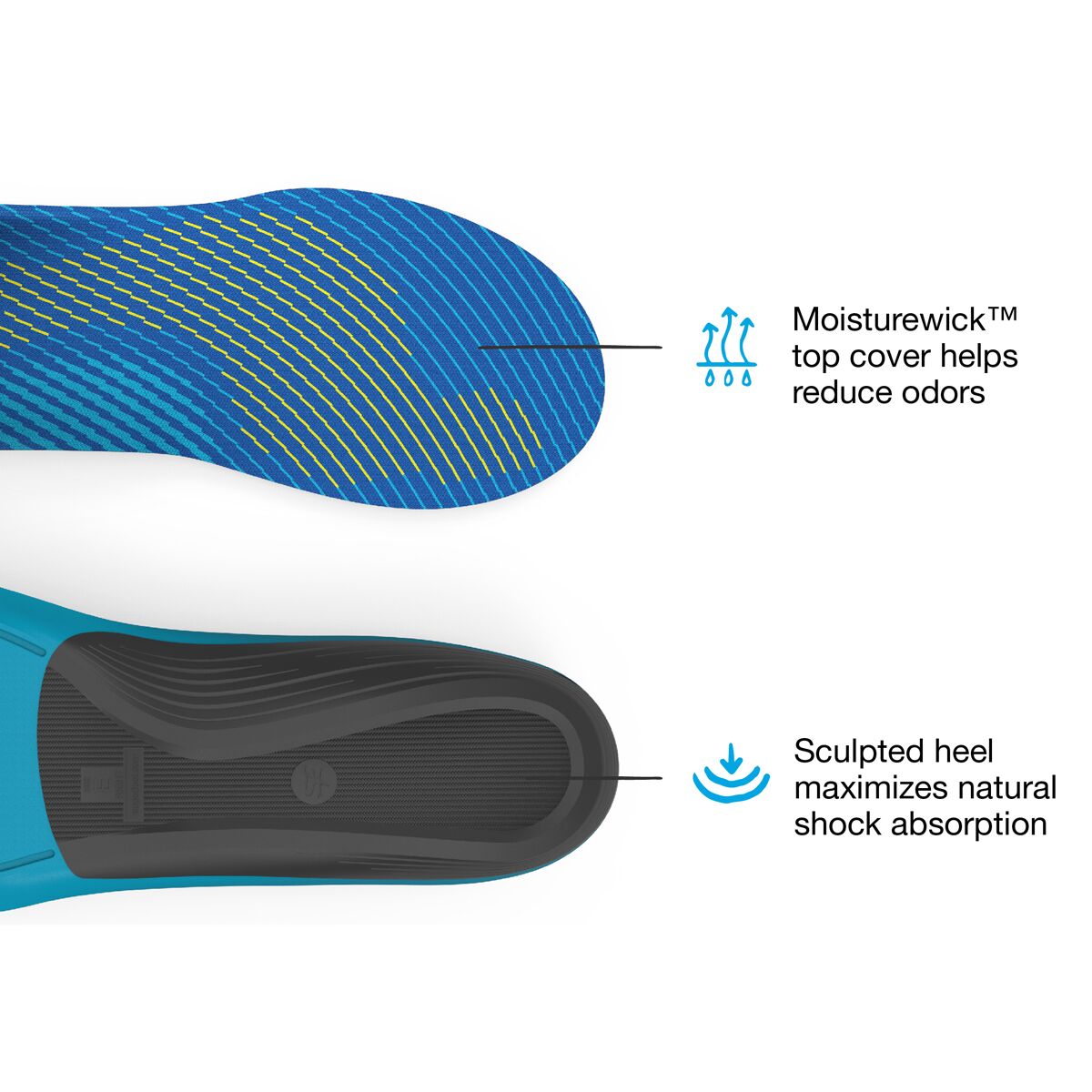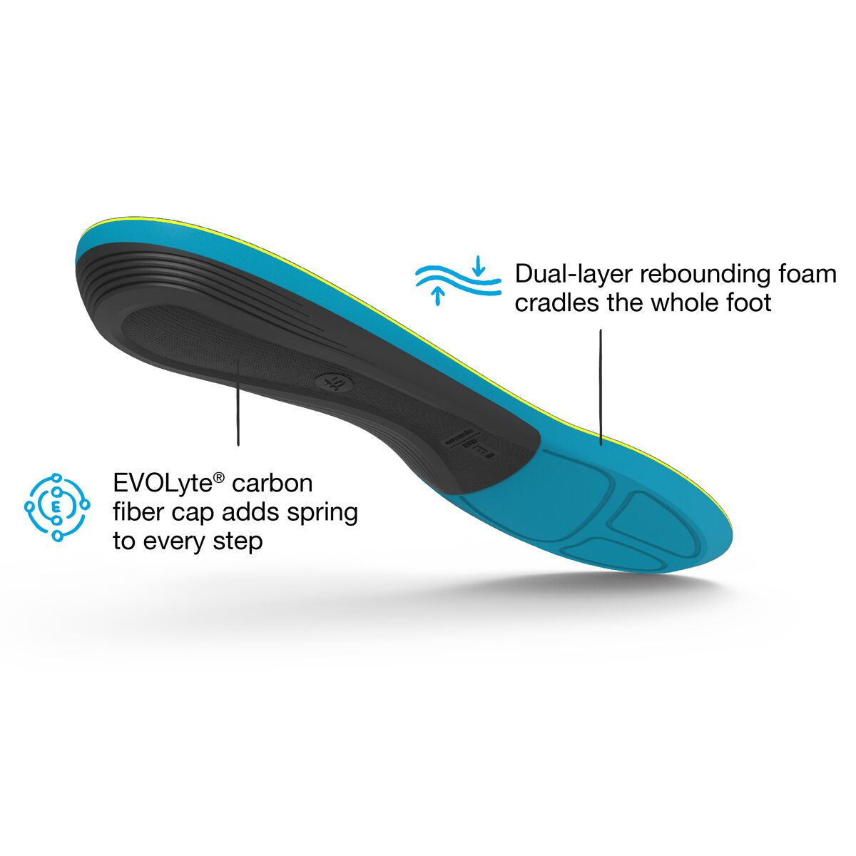 A dual-layer rebounding foam cushions every step, while the EVOLyte® carbon fiber cap enhances structure and energy return for an extra spring in our stride. Moisturewick™ technology keeps sweat under control, and the sculpted heel absorbs impact where it matters most. Whether we’re training for our next PR or building base miles, this footbed helps keep every run on track.