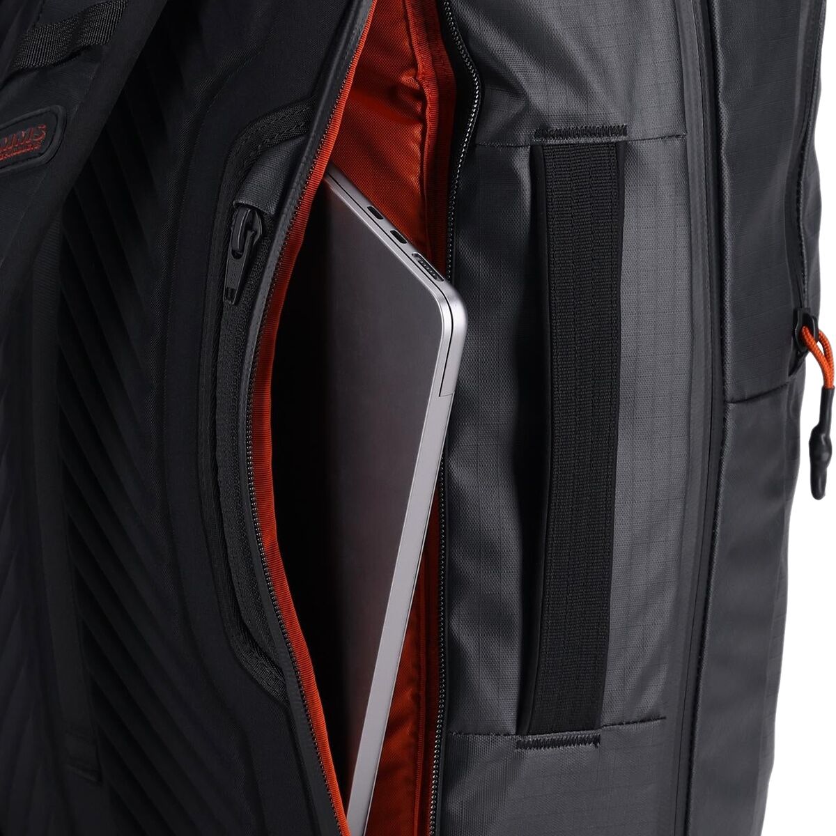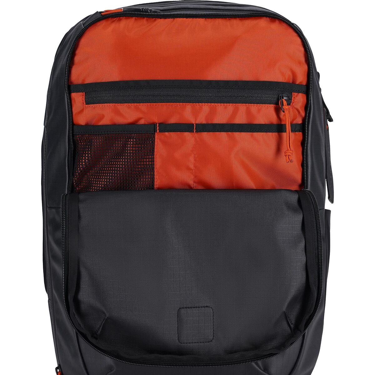 side-entry zippered laptop, side-entry passport, fleece-lined sunglass/accessory, front accessory (with multiple zippered mesh)